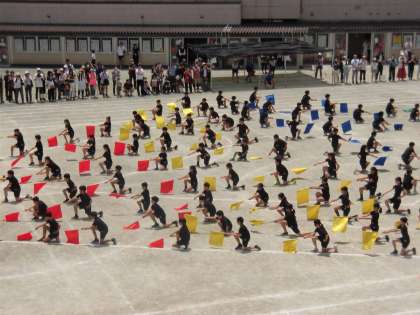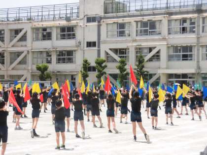 学年のテーマを「創造」と掲げ、自分たちで演技を作り上げました。演技後に感想を尋ねると、「皆で一致団結しこれまで練習してきた成果を発表できました。」「フラッグは細かいところまで動きやタイミングを合わせて、6年生のまとまりを表せるようにしました。」と熱く語っていました。