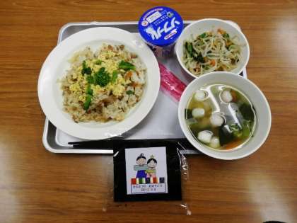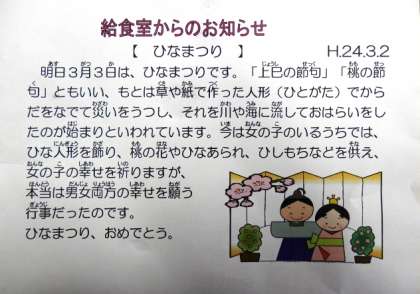 明日3月3日はひな祭りですね。給食のメニューは一日早いですが、ひな祭りメニューでした。