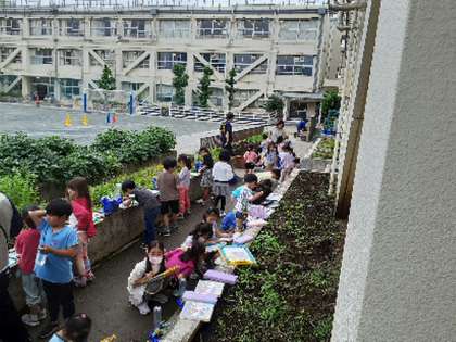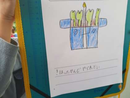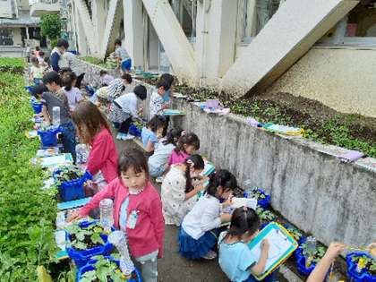 1年生が生活科で育てているアサガオの観察を行いました。毎朝一生懸命に水やりをしている姿を見かけます。徐々に大きくなるアサガオの様子をとても喜んでいました。さわった感じ、大きさ、においなど、今日の時点でのアサガオの様子全てを記録しようと頑張っていました。