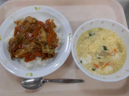 ホイコーロー丼 冬瓜と卵のスープ 牛乳