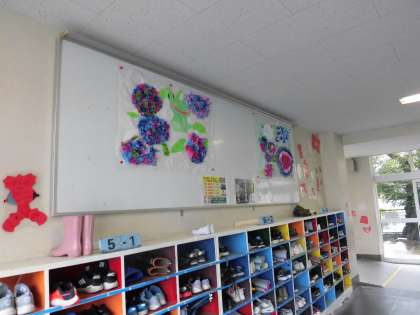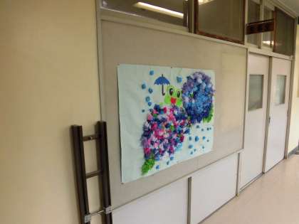 装飾アート委員会では「装飾で明正小を盛り上げよう」という目標を立てました。そこで、さっそく作品を仕上げました。5年生の下足場と事務室前に掲示されています。季節を意識したアジサイの花をお花紙で描かれています。カエルやカタツムリもいます。心和む作品ですね。今後も期待したいですね。