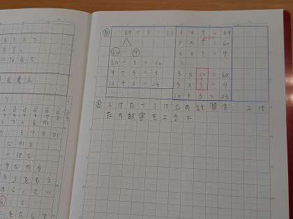 3年生算数「わり算」では、2けた÷1けたの計算の仕方を考えました。既習事項を用いて図や式で考え、自分のやり方をノートに書きます。全体で共有すると、さくらんぼを使ったり、十の位、一のくらいを分けて計算したり様々な方法がありました。色々な方法がありましたが、2けた÷1けたの計算は位ごとに分けて計算することができることを学びました。