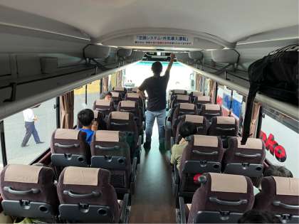 談合坂サービスエリアに到着し、トイレを済ませました。バスの中では、山手線ゲームやクイズで盛り上がっています。バスレク係の子たちが準備してくれました。少し寂しくなってしまった子も笑顔で元気に過ごしています。