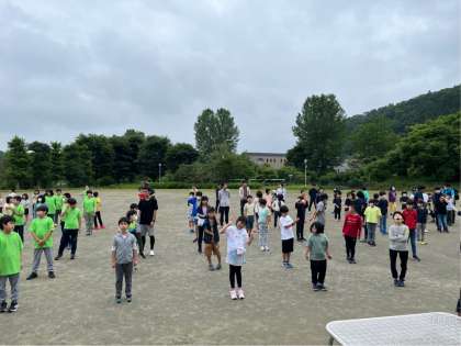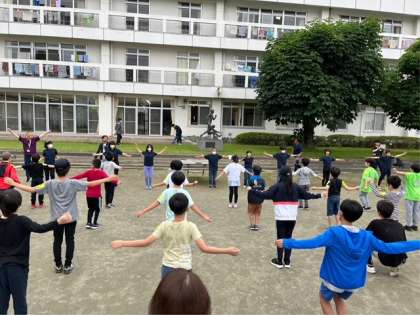 朝会を行いました。7校のみんなでラジオ体操をして体をほぐしました。