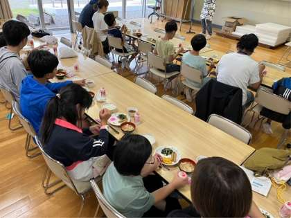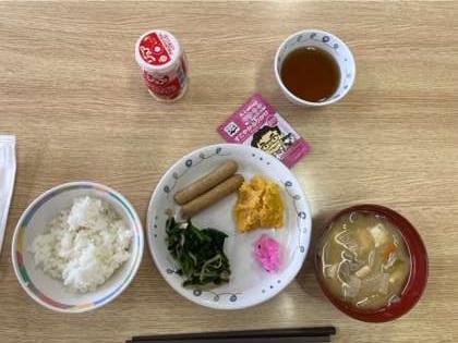 2日目の朝食です。メニューは炒り卵、ウインナー、豚汁などです。雨が降る予報のため、サファリパークに行く予定です。