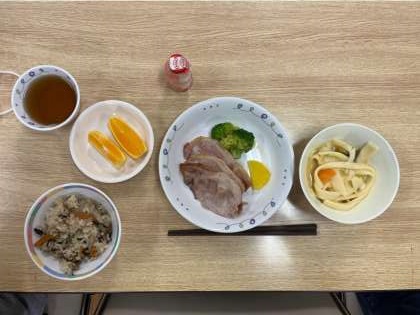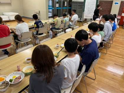 3日目の夕食です。豚肉、ほうとう、ブロッコリー、オレンジなどです。ご飯のお代わりをする子たちもいます。