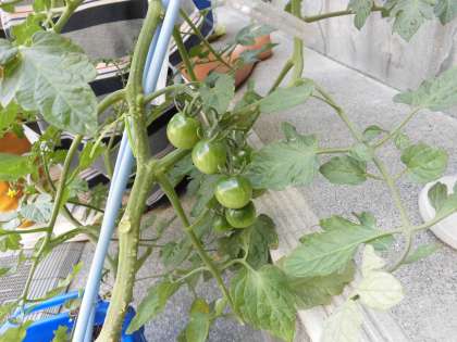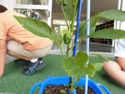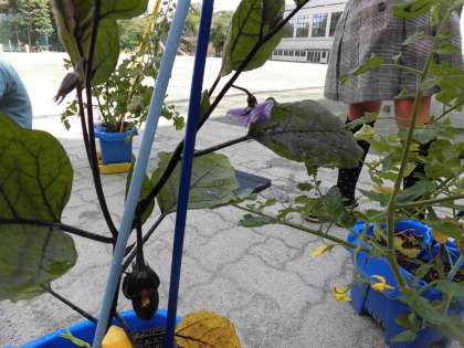 「ピーマンなってる!」元気な声が校庭から聞こえてきました。2年生が生活科で育てている野菜がさらに大きく育っています。どの野菜も実がつき始めていて、成長のはやさに驚きました。ミニトマトは、ぶどうの房のように並んでたくさん実をつけていました。葉も大きく背丈も高くなって、支柱2本では支えられなくなる鉢もありました。ピーマンもまだ小さいですが、青々とした実をあちらこちらに見つけることができました。なすは葉脈が濃い紫色になり、遠くから見てもなすが育っていることがわかります。ミニトマトを育てている児童は、「弟が好きだから、食べてもらいたい。」とにこにこしながら話してくれました。おうちの食卓に並ぶのももうすぐです。