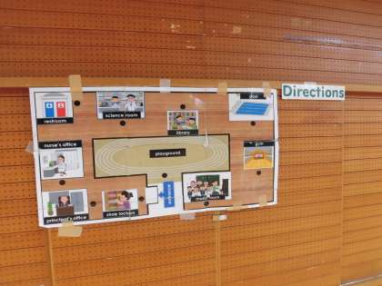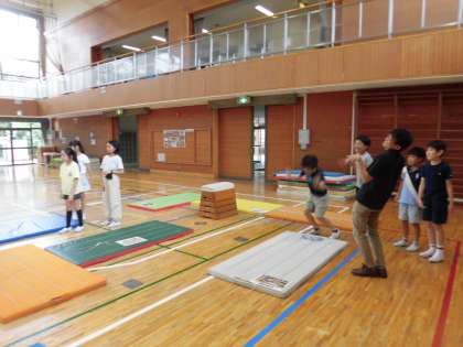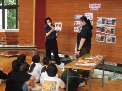 ゲストティーチャーを招いて体育館で英語体験教室を行いました。「ホスピタル」「ディレクション」「グローサリーストア」の3つのグループに分かれました。病院やスーパーでは絵カードを使って、どんなやり取りをするのかをはじめに学習しました。授業で学んでいるので、野菜や食品の名前はみんなすらすらと答えることができました。病院で使う用語は初めて目にする言葉が多かったようです。医師と患者を交替で体験しながら、病状の説明の仕方や、診察で使う英語を覚えました。「方向」はマットで学校内の通路を作り、ほかの人の言う指示を聞いて、音楽室や体育館、校長室など校内の施設にたどり着くゲームです。途中で「ジャンプ、ジャンプ!」「ダンス、ダンス!」とかけ声がかかると、「え、なんで。」ととまどいながらも指示に従って踊ったり、はねたり、それを見てみんなで笑ったりと、とても盛り上がりました。体全体を使いながら、身につけた英語でコミュニケーションをとる楽しい体験となりました。