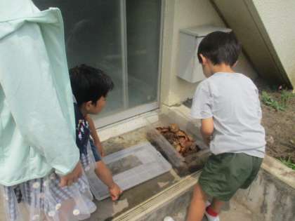 休み時間に、1年生に、「何をしているの?」と尋ねてみると、「アリを探しているんだよ。」と教えてくれました。のぞき込んでみると、アリが数匹、エサを探しているのでしょうか、歩いていました。アリを捕まえて、ケースに入れて、飼うのだそうです。他の場所では、教室で飼っているダンゴムシのケースに霧吹きで水をかけてしめらせていました。いろいろな虫を見たり、触ったりして親しむ様子がいろいろな場所で見られます。