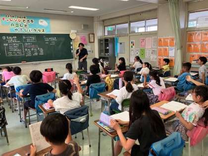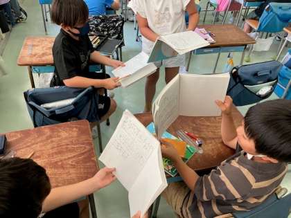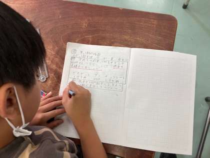 4年5組の算数の様子です。今日は買い物の場面で、買いたい物が500円で足りるかどうかを概数を使って見積もり、確かめるという学習内容でした。ビスケット179円、グミ113円、チョコレート184円です。一の位を四捨五入し十の位までの概数にする子、十の位を四捨五入し百の位までの概数にする子、この2種類の考えをする子がたくさんいました。少数の意見では、一の位を「切り上げる」という考えが出ました。なぜ切り上げたのかをみんなで考えました。「四捨五入をすると、少なく見積もる場合もあるので、お金が足りなくなるかもしれない。お金が足りなくならないように、切り上げて大きく見積もっているんだ」ということに気付きました。この考えにはみんなが納得しました。また、「四捨五入」「概数」「十の位までの概数」「切り上げる」など算数用語を正しく使い、論理的に考えを説明する力も伸びています。