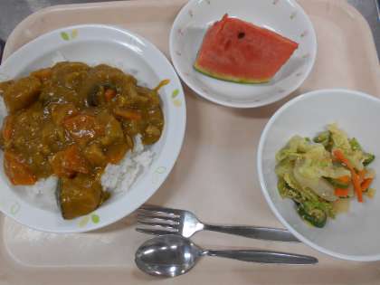 夏野菜のカレーライス こんにゃくサラダ すいか 牛乳