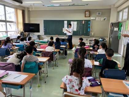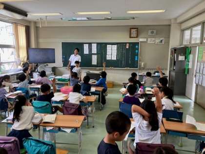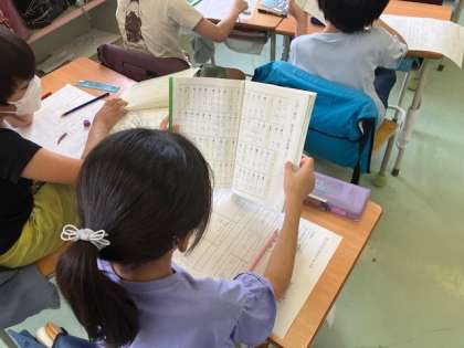 2年生の国語「同じ ぶぶんを もつ かん字」の学習の様子です。「林、森、村、休」などの漢字は「木」の部分を共通してもっていることをおさえ、「石、右、見、貝、町、男」の漢字を同じ部分に注目して仲間分けする活動を行いました。それぞれに「目グループ」「田グループ」と名前を付け、意欲的に仲間分けをしました。その後は、国語の教科書を参考にこれまで習った漢字の同じ部分をもつ仲間を探していきました。振り返りには「同じ部分をもつ漢字っていっぱいあるんだなと思った」と漢字学習への興味を広げました。