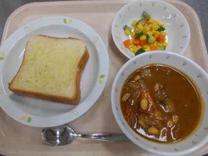 ガーリックチーズトースト ビーンズシチュー トロピカルサラダ 牛乳