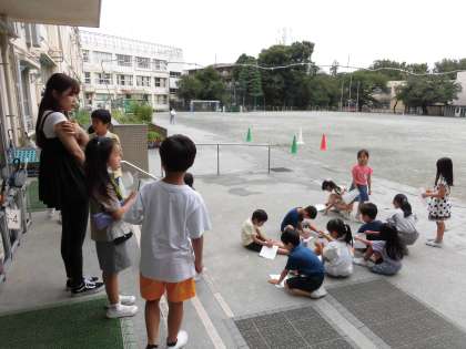 学校ではどんな音が聞こえてくるのかを探しに行きました。教室では?廊下に出ると?給食室からは?校庭に出ると?それぞれの場所で耳を澄ましてみました。教室では鉛筆で書く「さらさら」窓の外を飛んでいく飛行機の「ゴー」、廊下ではみんなが歩く「どんどん」給食室からはお皿を用意する「ガチャガチャ」、校庭では風の「サー」せみの「ミーンミーン」とたくさん見つけることができました。