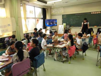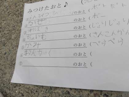 教室に戻ってからは、班に分かれて「なんの音でしょうクイズ」をしました。聞こえた場所とどんな音かをヒントに正解を考えます。同じものを表現していても、なかなか当たらない問題もありました。人によって聞こえ方が違うことが不思議な様子でした。「まだあるよ。」「これはわかる?」と時間になってもまだやりたそうでした。休み時間にお友達とクイズを出し合う姿が見られるかもしれません。
