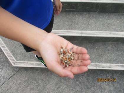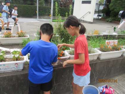 正門の花壇は、環境委員の皆さんが交代で水をあげたり、雑草を抜いたりと欠かさずに世話をしてくれています。何回も水をくみに行ったり、小さな雑草も残さず手入れをしたりする姿にいつも感心しています。丁寧に育ててきたマリーゴールドにきれいな花が咲き、その後、種ができたそうです。校内放送で「欲しい人は取りに来てください。」と呼びかけました。種をもらった人たちがまたきれいな花を咲かせることができるとうれしいですね。