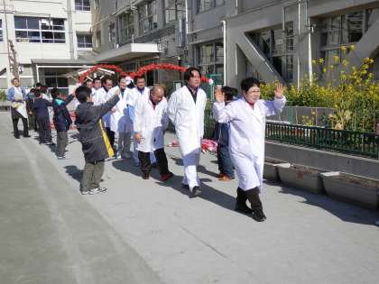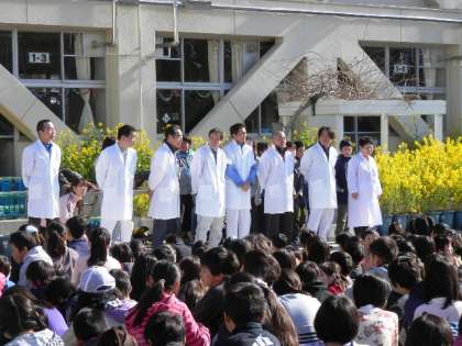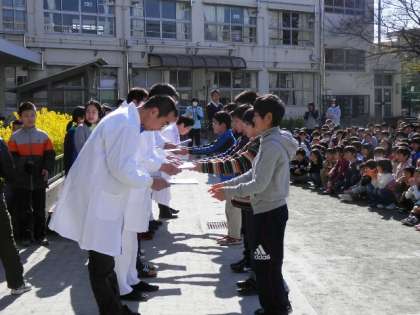 来年度、明正小学校の給食室は増築工事となります。そのため、栄養士さん、調理主事さんの皆さんに子ども達から、「おいしい給食ありがとう」の集会を催しました。歌と寄せ書きのプレゼントをしました。栄養士さん、調理主事さん、本当にありがとうございました。