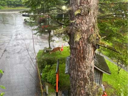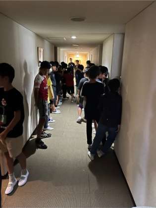 部屋に入って荷物を整理してから、避難訓練を行いました。非常口を確認しました。ホテルの前には鹿が遊びに来ています。