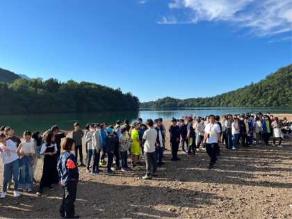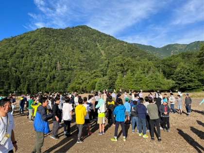 湯ノ湖の湖畔で朝会を行いました。「フレッシュ体操」で身体を整えました。