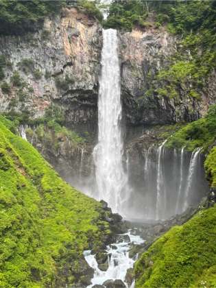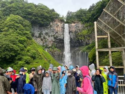 華厳の滝に到着しました。雨が降り出しましたが、滝には霧がかかっておらず、きれいに見えます。