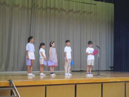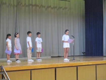 また、「他のクラスの子たちとも友達になる。」「友達をたくさんつくる、」「授業で発表をたくさんしたい。得意な算数からがんばる。」「時間を大切にしたい。」「クラスの目標を達成できるように協力する。」など、これからどのような姿が見られるのか楽しみです。2学期も「やってみよう!」を合い言葉にいろいろなことにチャレンジしてほしいと思います。