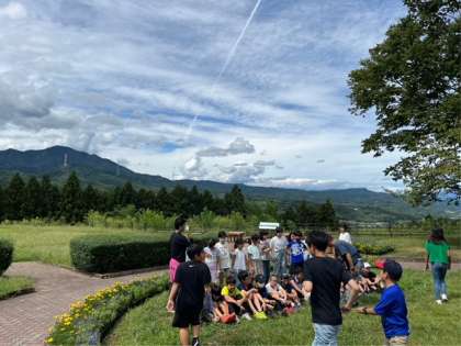 赤城高原サービスエリアに到着しました。吹く風が気持ちいいです。トンボがたくさん飛んでいます。学級毎に集合写真を撮りました。