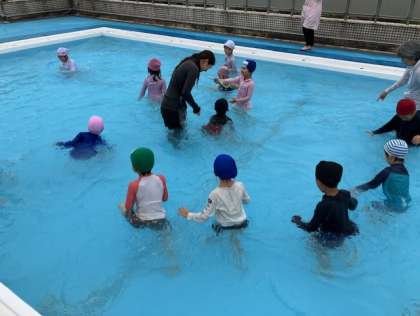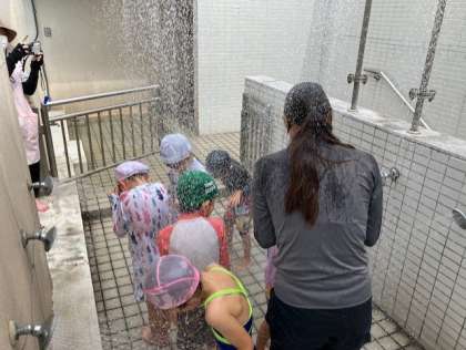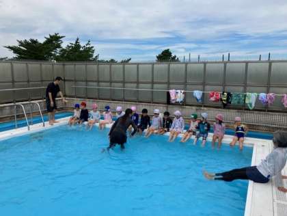 午前中に、はあと保育園の年長さんが本校の小プールを使って、水遊びをしました。普段とは違うプールにどの子も目を輝かせていました。担任の先生の指示をよく聞いて、安全に楽しく遊んでいました。とても楽しかったようで、急遽、来週も本校のプールを利用することになりました。2学期、小学校の施設利用に加えて1年生や5年生との交流を計画しています。