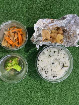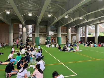 屋根付き広場で昼食を食べます。みんなグループになって、とても楽しそうです。