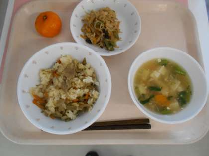 豚肉とごぼうのごはん 切り干し大根とさつま揚げの煮つけ 吉野汁 冷凍みかん