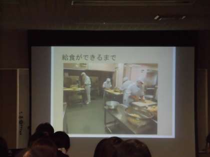 コロナの影響により開催が見合わされていた給食試食会が、PTAの方のご尽力により4年ぶりに行われました。台風が近づく悪天候でしたが、たくさんの方にご参加いただきました。はじめに栄養士より本校の給食について講演がありました。子どもたちに楽しく食べてもらうことはもちろん、栄養のバランス、東京や世田谷でとれた食材を多く使っていることなどの説明がありました。保護者の方のなかには、配られた資料を読みながら、熱心にメモを取る方もいらっしゃいました。給食ができるまでの工程をスライドで説明した時には、大量に用意された食材や、手間の多さに驚きの声が上がっていました。