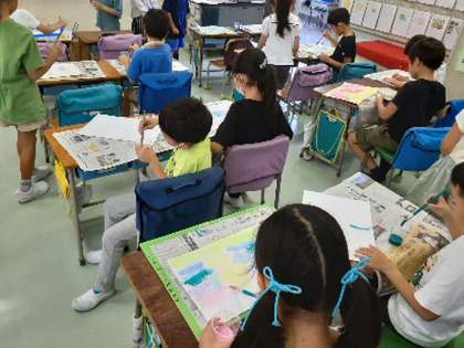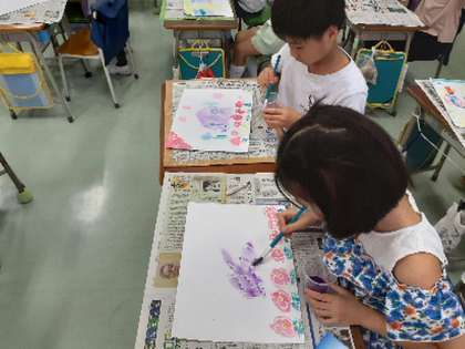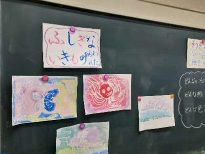 2年4組の図工の様子です。画用紙に白のクレヨンで下絵を描き、その上から水性絵の具を塗ると、それぞれが考えた生き物が姿を表します。白のクレヨンで体の模様なども描くとはっきりとその生き物が見てとれます。友達と作品を見せ合い、何の生き物でどこに住んでいて、どんな特徴があるかなど紹介し合いました。発想豊かに表現活動を楽しみました。