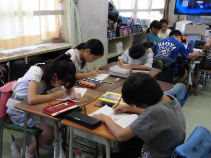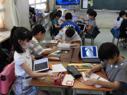 1組では、「すずしくなると」というテーマで、昨日観察した校庭の桜の木の様子を観察カードにまとめました。1学期に観察した時と比べてどのような変化がみられるかを、絵と文章で表します。「黄色い葉が混じってきている」「葉の数が減っていた」「つるつるしていた葉の表面が、ざらざらになっていた」「葉に穴が開いていた」などの記録がされていました。教員が撮影した写真を、みんなで共有しながら、さらに細かい観察をしました。木全体の様子に注目していたり、葉の1枚を詳しく調べたりと、観察結果の表し方にも違いが見られました。