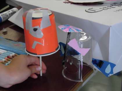 2年生の図工では、紙コップ、紙皿、ストローや割り箸など身近な材料を使って「ひらめきおもちゃ」を制作しました。さまざまな材料を切ったり、折ったり、貼ったりして、ゆらゆらゆれるヒヨコ、つるして飾るタコ、紙コップのけん玉、素敵な音色のマラカスやかわいいお化けなど、工夫がいっぱい詰まったおもちゃが完成しました。