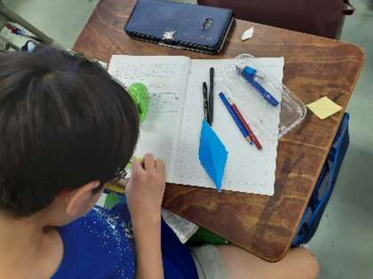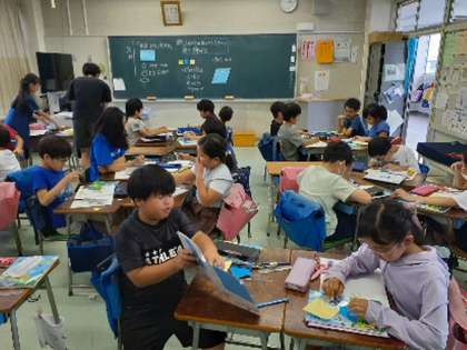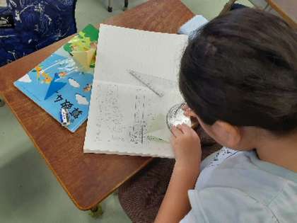 4年4組の算数の様子です。今日はひし形の図形との出会いでした。折り紙を2回折り、できた長方形にはさみを入れるとダイヤの形になりました。その形を辺の長さ、角の大きさ、平行、という視点に沿って調べました。調べた結果を出し合い、そのような特徴をもつ図形を「ひし形」ということをまとめました。操作活動をとおして体験的に学び、図形について楽しく学習しました。