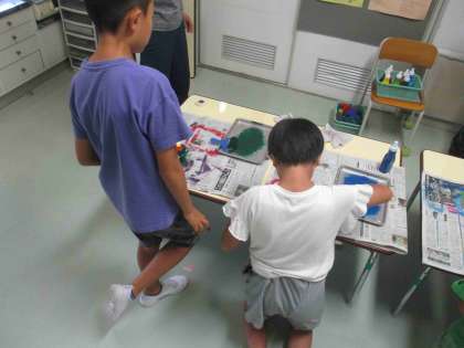 画用紙にマスキングテープを張り、ローラーで色を付けます。ドライヤーで乾かし、テープをはがすと、想像していなかったような模様ができあがります。それを何回も繰り返すと、素敵な模様が浮かび上がってきました。「きれいでしょ!」と見せてくれました。