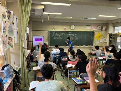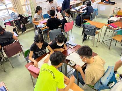 6年生は算数で「比例」や「反比例」について学習しています。2つの変わる数や量の関係から、決まった数を見付けていきます。リサイクル用紙の枚数を求めるために、1枚の重さと全体の重さから比例の関係を使って計算しました。「ピッタリだ」「2g差だった」という声が聞こえました。実際にやってみることで、比例の関係をよりつかむことができたようです。