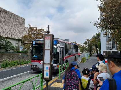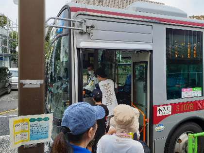 ひまわり学級の校外学習です。子どもたち自身の力で二子玉川公園を目指します。グループごとに時間差で出発し、別々のバスに乗車します。最終グループが無事にバスに乗り込みました。上級生が上手にリードしています。