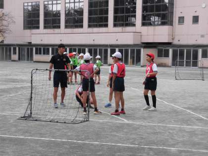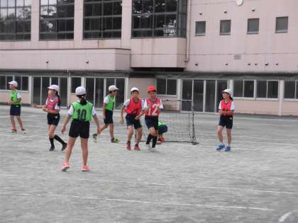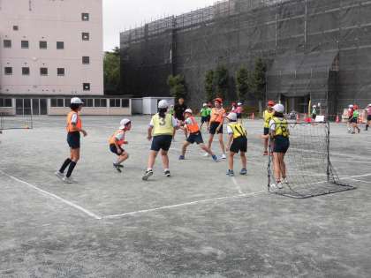 5年生の体育では「ハンドボール」を学習しています。「シュートにつなげるためのパス」をめあてに、チームごとに作戦をたててゲームをしました。ゲームの合間に「横パスが有効的!」「相手がいないフリーな相手にパスをする!」など、有効なパスはどんなパスなのか意見を出し合いました。相手の横や前や後ろでパスを受け取ることや、短いパスがつながりやすいことを学んで、再度ゲーム開始です。学習したことを活かし、どのチームも次々とパスを繋げて見事にゴールを決めていました。「こっちこっち!」「近くにきて!」とパスを繋げるために声を出し合うことも大切なことがわかりました。とても白熱したゲームになりました。
