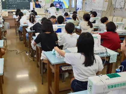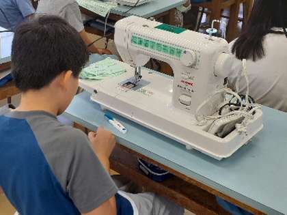 5年生の家庭科では、ミシンを使っています。この時間は、ミシンに上糸と下糸をかけて縫うことをしました。難しい作業ですが、先生の話を聞いて、協力しながら作業をしていました。