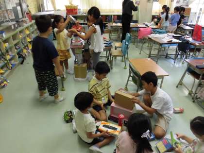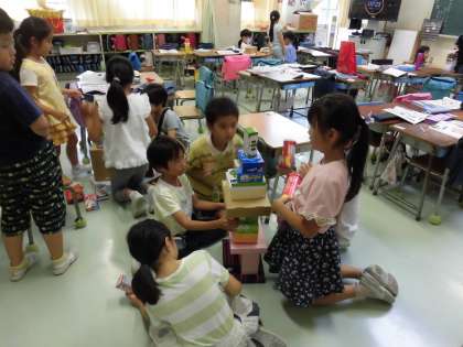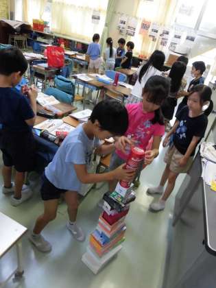 1年生の算数では「かたちあそび」で立体図形の理解する学習をしています。それぞれ家庭から持ち寄った様々な形の空き箱を使って、高く積み上げるゲームをしました。どうしたら高く積み上げることができるのかについて「土台を大きくする!」「上の方に細長い箱をおく!」などの意見が出ました。崩れてもあきらめずに、何度でも挑戦していました。グループで「これはデコボコしてるからバランス悪いよ!」「次はこの箱がいい!」「もう少しこっちに置こう!」など意見を出し合い協力しながら行いました。制限時間が近づいてきて焦る気持ちに「落ち着こう!落ち着こう!」と声を掛け合っている姿もありました。ゲームを楽しみつつ、学習することができました。