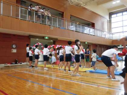 チーム戦での障害物競走や、1年生がカードに書かれたお題にあう6年生を見つけて一緒にゴールを目指すかりびと競争などをしました。1年生が大きな声で「アニメが好きな人!」「友だち思いな人!」などのお題を伝えると、6年生も「はい!はい!」と手を挙げ、手を繋いで一緒にゴールまで走りました。インタビューでは、1年生から「楽しかった!」「面白かった!」という声がたくさん聞かれました。最後には、参加賞とし全員が手作りのメダルをもらい、1年生は大喜びでした。そして、手作りの花道、クラッカー、花吹雪を通って体育館をあとにしました。