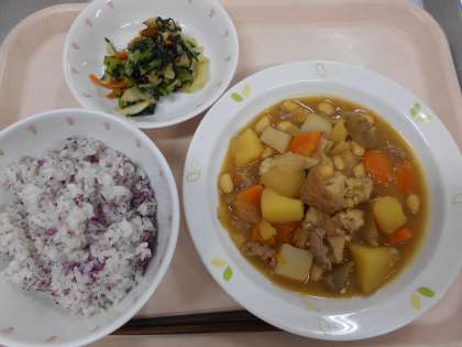 ゆかりごはん 大豆入り五目うま煮 いそべ和え 牛乳