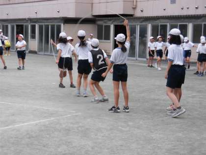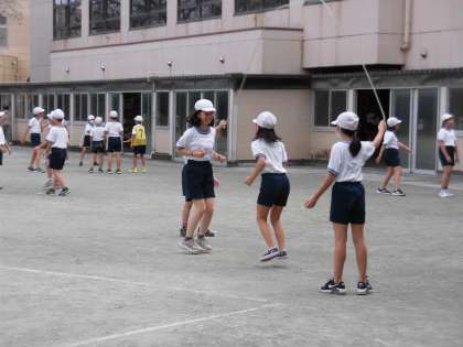 10月はどの学年も体育の授業でも大縄跳びの練習をしています。5年生の体育ではグループに分かれて、「何人入れるか」「2人で跳びながらジャンケン」「逆回し」など、だんだんと難しい課題に挑戦していました。どうやったら上手く跳べるか声を掛け合い、失敗しても「ドンマイ!ドンマイ!」「もう1回やってみようよ!」と協力したり、うまく跳べたら拍手をしたり、お互い協力して取り組むことができました。どのグループもみんなが楽しみながら練習することができました。
