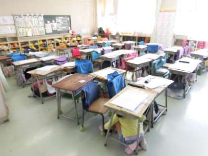 1年生の教室を見ると、緊急地震速報を聞いて、騒がずすばやく机の下にもぐっていました。これまでに身につけてきた訓練の時の約束を、しっかり守っていて立派でした。