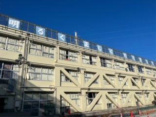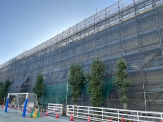 校舎の外壁工事が終わりに近づいています。足場が外され、きれいになった校舎が見えてきました。西側の校舎は、まだ足場が残っていますが、塗装は終わったようです。