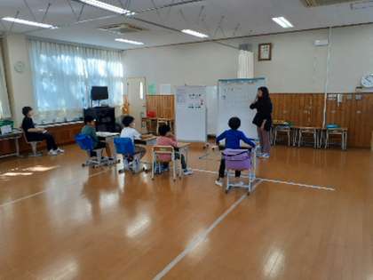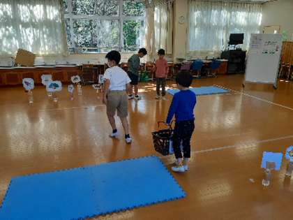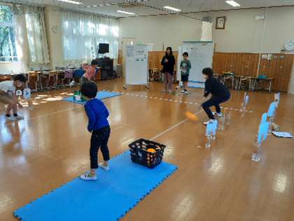 すまいる学級の活動の様子です。ペットボトルを的にして、ボールを当ててペットボトルを倒すゲームをとおして、自分の役割を果たすことや、協力の仕方を学びまさした。特に遊んだ後の片付け作業が協力の仕方を学ぶ大事な活動です。散らばったボールをペアの友達と協力して片付けました。かごを持つのは誰にするか、どのボールから片付けるか、思いや考えを伝え合い、合意のうえで一緒に片付けをしました。協力できると気持ちがすっきりすることを体験的に学んでいました。