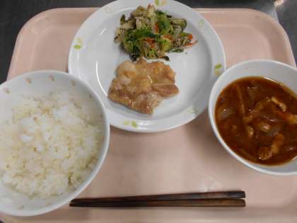 ごはん チキンステーキにんにくみそソース 野菜のゆかり和え