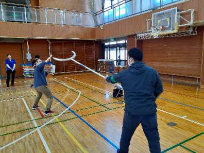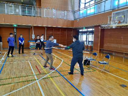 避難訓練後の中休みに参加可能な教員が、成城警察の方からさすまたの使い方について講習を受けました。さすまたは長く持って使うと不審者との距離が保てることや、持ったさすまたをしたに向けて構えるよりも、相手の目線の高さに先端を合わせるようにもつと、相手は恐怖感をかんじることなど、実技を通して教えてくださいました。本物の警察官の話、経験をうかがえたことは教職員にとって素晴らしい研修となりました。
