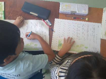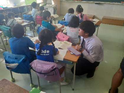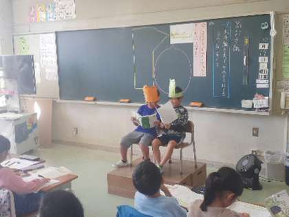 2年5組の2時間目は、若手教員の研究授業を行いました。教育委員会から講師を招き、授業を通して子どもたちの学習の様子や教員の指導を見ていただきました。国語「お手紙」のお話を読み、お手紙の到着を待つがまくんとかえるくんの気持ちから二人がどんな会話をしながら玄関の前に座っていたのかを考えました。席の隣同士で話し合いました。幸せな気持ちという本文の記述から、幸せそうな会話を想像して会話文を作っていきました。後半のなりきりタイムでは動きもつけながら、考えた会話のやりとりを披露しました。みんなが意欲的に学習する様子に、講師の先生も感心しきりでした。
