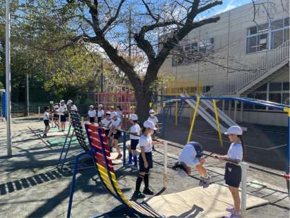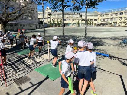 体育で鉄棒運動に取り組んでいます。学習カードを活用して、「上る技」「回る技」「おりる技」を確かめながら進めていました。友達と教え合いながら互いに技が高まるようがんばっています。「できた!」といううれしそうな声も聞こえてきました。